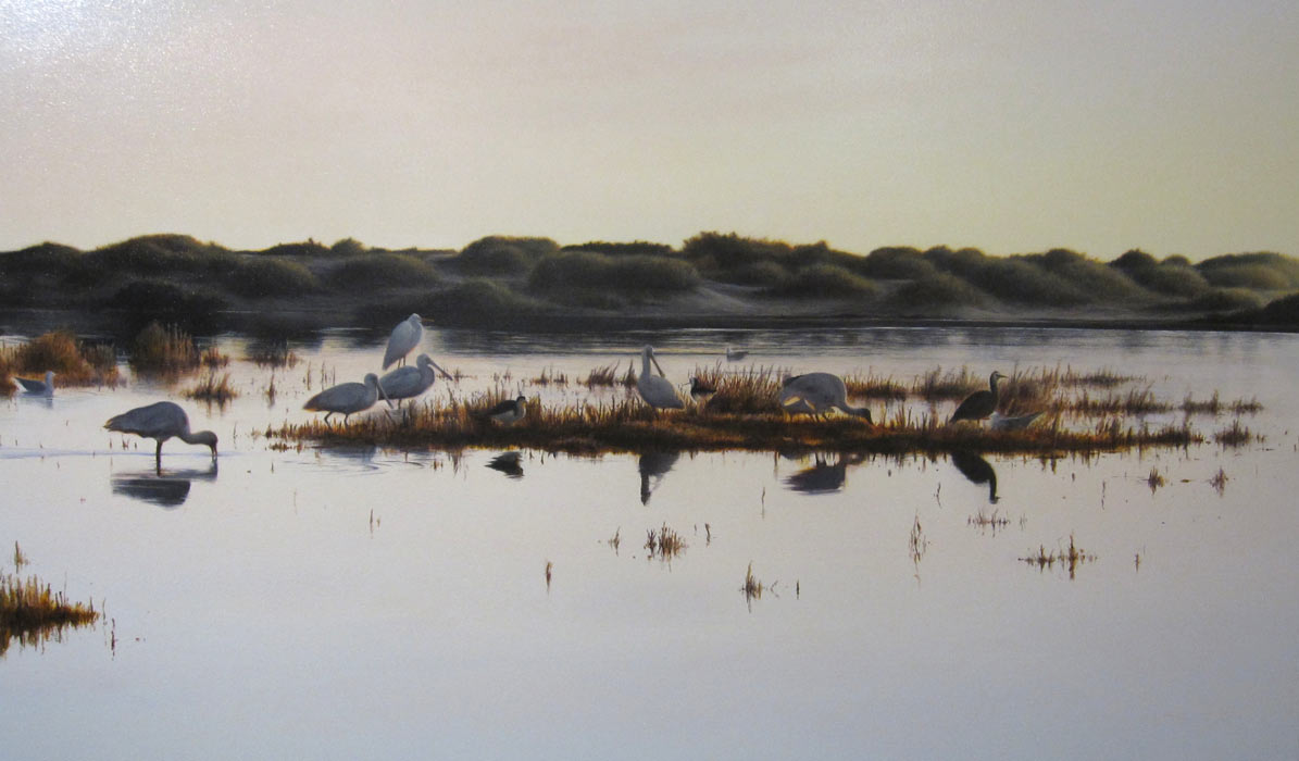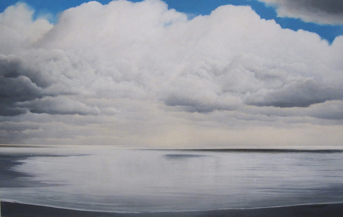 My use of ocean, sky and landscape imagery is part of a wider investigation into the effects we associate with place and time, weather and light. The information I gather refers to the scientific and mathematical nature of reality. When choosing a composition it is factors like scale and perspective and the activities of nature, like how the waves break and clouds float and a successful portrayal of these issues that determine whether it will be possible for me to resolve the “illusion” and create the concept of scenery, in paint.